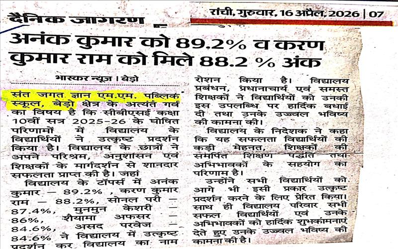 st. jagat Gyan public school Result publised in paper class X